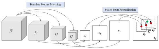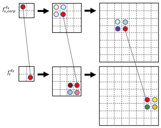 Suppose that the cropped searching feature map , and the template feature map and match points are obtained through Formulas (12)–(17). and are up-sampled by bilinear interpolation. Note that the maximum pooling size in our model is 2 ∗ 2; thus, each point corresponds to four points in the corresponding area of the up-sampled feature map. Furthermore, we use the cosine distance to compare the similarity between feature points. We first compare the most similar points in the up-sampled feature map; then, we confirm the most similar points between the two feature maps and proceed to the original resolution according to the down-sampling times. The processing stage is illustrated in Figure 8 and can be formulated as follows: