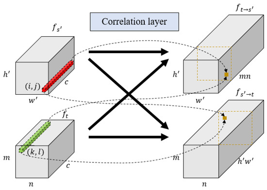 where denotes the feature map of the cropped search image. is the correlation layer, and is the template image dose for the correlation operation with the cropped search image. Correspondingly, is the cropped search image dose for the correlation operation with the template image. and are transpose relations, which contain all of the pairwise points.