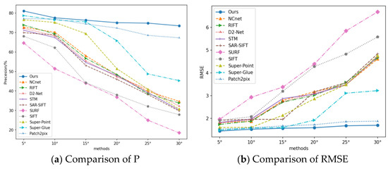 During training, 20% of the data was selected for testing, and 80% was selected for training with each dataset. We resized the search image to 512*512 and the template image to 128*128. The model parameters were optimized by SGD with a momentum of 0.9. The learning rate (LR) was set to 5 × 10−3 in the first 50 epochs and decayed every 50 epochs by 0.1 × 5 × 10−3. All of the experiments were implemented with an NVIDIA 2080Ti. In order to illustrate the effectiveness of our method, we compared both handcrafted and deep feature methods, including SIFT [16], SURF [17], D2-Net [11], NCnet [21], SuperPoint [19], SuperGlue [20], Patch2pix [22], RIFT [32], STM [33] and SAR-SIFT [34]. For the performance evaluation of the different methods, we introduced the Precision (P), Recall (R) and root-mean-square error (RMSE) to perform a quantitative analysis. They can be formulated as follows: