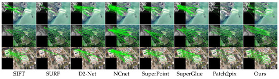 From the results in Table 4, it can be seen that all of the methods obtained better performance than those described in Section 3.3 and Section 3.4. The main reason for this phenomenon is that the template image and the search image were homologous. There was little difference between handcrafted and deep-learning-based methods in homologous image matching because the homologous images had similar pixel intensities in the matched feature points. However, the experiments still reflected the methods’ resistance capability for viewpoint change. Our method obtained 85.16%, 86.32% and 1.397 for P, R and RMSE, respectively. Compared with SuperGlue [20] and Patch2pix [22], we achieved higher values of 3.87% and 1.68% for P, respectively. On the other hand, the traditional method, SIFT [16], which does not involve training, obtained 64.16% and 65.43% for P and R, being approximately 10% lower than the values for the deep learning methods.
