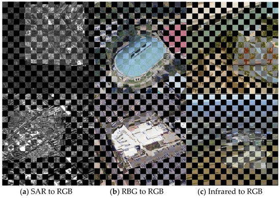 The SAR to RGB and RGB to RGB datasets are openly available in a public repository. They can be downloaded at https://mediatum.ub.tum.de/1436631, accessed on 10 June 2022. and https://drive.google.com/file/d/1iVnP4gjw-iHXa0KerZQ1IfIO0i1jADsR/view?usp=sharing, accessed on 1 March 2022. The infrared to RGB dataset is available on request from the authors. The data that support the findings of this study are available from the corresponding author upon reasonable request.