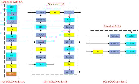 The SA module has the convenient feature of being plug-and-play and has been applied in some networks. However, there is currently no absolute theoretical basis for determining which part of the YOLOv5s network is best in terms of integration. The YOLOv5s network can be divided into four modules: input, backbone, neck, and head. The input module mainly performs preprocessing operations on images; it does not perform feature extraction processing on images. Therefore, in this study, fusion network models that incorporate the SA module into the backbone, neck, and head modules of YOLOv5s were designed and named YOLOv5s-SA-A, YOLOv5s-SA-B, and YOLOv5s-SA-C, respectively.