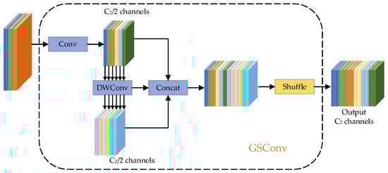 Although the introduction of the decoupled head and SPPCSPC modules can improve the detection performance of the YOLOv5s network model, these modules increase the parameter count of the model, which is unfavorable for creating lightweight networks. To design lightweight networks, deep separable convolution (DSC) modules are typically used instead of conventional convolutional modules. The advantage of DSC modules is their efficient computational capability, as their parameter count and computational workload are approximately one-third of those of traditional convolutional modules. However, during the feature extraction process, the channel information of the input image is separated in the calculation process, which can result in lower feature extraction and fusion capabilities compared to standard convolutional modules. To effectively utilize the computational capability of DSC and ensure that its detection accuracy reaches the level of standard convolution (SC), the GSconv [109] module is proposed based on SC, DSC, and shuffle modules. The network structure is shown in Figure 6. Firstly, the feature map with C1 channels is split into two parts, where half of the feature map is used for deep separable convolution and the remaining part is used for standard convolution. Then, the two-channel feature maps are combined for feature concatenation. Shuffle is a channel mixing technique that allows information from the SC module to completely mix with the DSC output by transmitting its feature information across various channels, thus achieving channel information interaction.