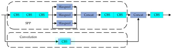 The SPPCSPC module [112] is built on the basis of the SPP module and the CSP structure, as shown in Figure 8. The module first divides the features extracted by the C3 module of the backbone into two parts: the SPP and conventional convolution operations. The SPP structure consists of four branches, corresponding to max-pooling operations with pool kernel sizes of 1, 5, 9, and 13. These four different pool kernels allow the SPPCSPC structure to handle objects with four different receptive fields, better distinguishing small and large targets. Finally, the SPP operation and conventional convolution operation are merged together by Concat to achieve faster speed and higher accuracy.