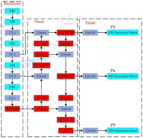 Incorporating the improvements to the YOLOv5s backbone, this study replaced the SPPF module with the SPPCSPG module to enhance detection accuracy. In the neck structure, all Conv modules were replaced with GSConv modules and the improved VoV-GSCSP module was introduced to reduce the parameters and computation brought about by feature pyramid structure upgrades. To address the issue of limited semantic information and receptive fields caused by nearest-neighbor interpolation up-sampling operations in the original network model, this study adopted the CARAFE module to replace the nearest-neighbor interpolation up-sampling module, which reorganizes feature points with similar semantic information in a content-aware way and aggregates features in a larger receptive field to perform up-sampling operations. To address the problem of inaccurate target localization and weak feature expression capability in the original network model, this study introduced the SA attention module in the head module. Finally, to improve the performance metrics of the model, the DD-head was used in the detection layer of the YOLOv5s model to accomplish classification and regression tasks. The improved network model structure is shown in Figure 9.