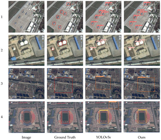 In the era of big data, due to the development and progress of machine learning technology represented by deep learning, artificial intelligence can better cope with complex environments and tasks through continuous learning and adaptation. By processing and analyzing large-scale and high-dimensional data [1], it can reveal the patterns and patterns behind the data, supporting more accurate predictions and decisions [2,3,4]. By exploring potential patterns in data, new knowledge and innovation can be discovered, supporting the development of various sciences and technologies. Therefore, in recent years, artificial intelligence has been gradually applied to speech recognition, natural language processing, computer vision, and other fields. In the field of artificial intelligence, computer vision technology has found widespread application in diverse fields such as intelligent security [5], autonomous driving [6], remote sensing monitoring [7,8], medical and pharmaceuticals [9,10], agriculture [11], intelligent transportation [12], and information security [13]. Computer vision tasks can be categorized into image classification [14], object detection [15], and image segmentation [16]. The core task of object detection is to determine the categories and positions of multiple objects in the image and to give corresponding detection boxes and object categories for each object. Remote sensing images contain a wealth of detailed information, which can intuitively reflect the shape, color, and texture of ground targets. Remote sensing target detection, as a fundamental technique, is widely applied in various fields, such as urban planning [17], land use [18], traffic guidance [19], and military surveillance [20]. With the development of ground observation technology, the scale of high-resolution remote sensing image data has been continuously increasing. High-resolution remote sensing images provide higher image quality and more abundant, detailed information, which presents greater opportunities for the development of target detection in the field of remote sensing. Target detection can be divided into two main categories: traditional object detection algorithms and deep learning-based object detection algorithms. Traditional object detection algorithms mainly rely on traditional feature extractors [21] and use sliding windows to generate object candidate regions. Representative algorithms include the Viola–Jones detector (VJ-Det) [22], the Histogram of Oriented Gradient (HOG) detector [23], and the deformable part model detector (DPM) [24]. With the development of deep learning, convolutional neural networks (CNNs) have gradually been applied to object detection tasks. Based on deep learning, object detection technology can use multi-structured network models and powerful training algorithms to adaptively learn high-level semantic information from images. Image features are extracted and fed into a classification network to complete the tasks of object classification and localization, thereby effectively improving the accuracy and efficiency of object detection tasks.
