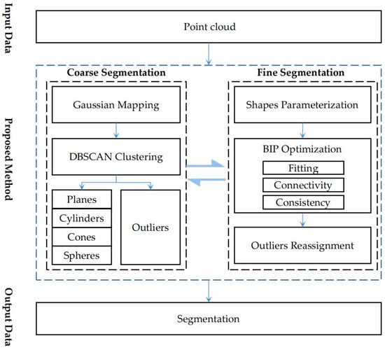 Starting from the LiDAR point cloud, the overall workflow of our method is shown in Figure 1. The proposed method adopts a coarse-to-fine strategy and consists of two stages. In the coarse segmentation stage, because the normal vectors of the same geometric shapes are distributed centrally on the Gaussian sphere, the normal vectors of the point cloud are mapped onto the Gaussian sphere. Then, according to the different density distributions presented by the groups on the Gaussian sphere, we use the DBSCAN clustering method to classify the different shapes and complete the coarse extraction. In the fine segmentation stage, the main task consists of two components: one is to refine each shape class by combining Euclidean distance classification and parameterization; the other is to construct an optimization function, which reassigns the outliers using BIP to complete the fine segmentation.