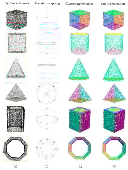 Shapes segmentation on synthetic datasets. (a) Point cloud. (b) Gaussian mapping. (c) Coarse segmentation, in which gray points denote outlier points. (d) Fine segmentation.