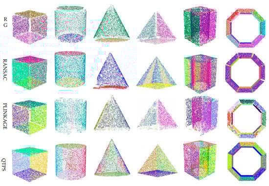 The shape detection ability of the comparison methods is shown in Figure 6. The RG method can segment different shapes, including plane and curved surfaces but cannot handle boundaries. The RANSAC method can segment single shapes but performs weakly when handling mixed shapes and is prone to over-segmentation. The PLINKAGE method produces under-segmentation when dealing with mixed shapes. The QTPS method has strong planar segmentation ability and offers the strongest boundary handling capability compared to the other three methods, but it cannot segment curved surfaces.