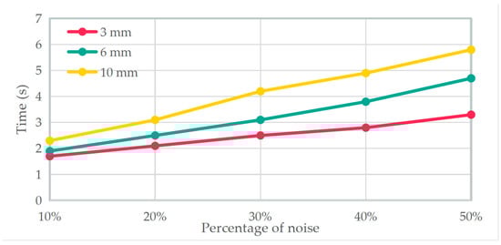 The execution time of the proposed algorithm at different noise levels is shown in Figure 7, which clearly shows that the time consumption is proportional to the number of noise points and the standard deviation of the noise. There are two reasons for this result: (1) the more noise points there are, the more data processing is necessary, which increases the processing time; (2) the larger the standard deviation of the noise, the larger the bias of the normal vectors calculated by PCA. The PCA is a least-squares procedure fitting to the local surface with robustness. Still, when the standard deviation of the noise is too large, the accuracy of the estimated normal vectors decreases. Thus, the larger the standard deviation of the noise, the larger the bias of the estimated normal vectors, which in turn leads to more isolated points on the Gaussian sphere and more time being required to reassign these isolated points.