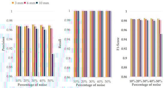 The accuracy metrics of the segmentation results at different noise levels are shown in Figure 8. The figure shows that the proposed algorithm gives excellent segmentation results when the percentage of additional noise is less than 50%, and the noise standard deviation is less than 10 mm. In these cases, the noise not located on the plane boundary is fitted into the plane model and does not influence the model parameters. The noise located on the plane boundary may be reassigned incorrectly, so it causes some fluctuation in the precision at different noise levels. However, when the percentage of additional noise is 50%, and the standard deviation is 10 mm, the precision decreases substantially. By analyzing the procedures and the final segmentation results, there is over-segmentation in the result, which is caused by the confusion of the inner and outlier points on the Gaussian square. In addition, our method uses the minimum energy function to reassign the outlier points, so the experimental result for Recall is 1 because FN = 0.