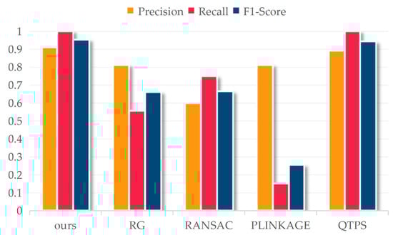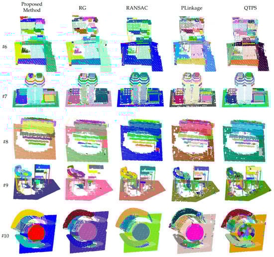 Figure 14 shows the accuracy metrics of the proposed method and comparison methods on ten datasets. These metrics can reflect the quality of segmentation results in different aspects. For the three metrics of Precisionp, Recallp and F1-Scorep, the segmentation results are analyzed in terms of the point level. A lower Precisionp value indicates that the segmentation results in a large number of mis-segmented points. For example, in dataset #4, the RG method over-segments the same plane into multiple planes. In dataset #10, the QTPS method has difficulty handling the curved surface structure, causing the surface to be over-segmented into multiple small facets. A lower value of Recallp indicates that more points in the point cloud are not segmented and are finally considered outliers. For example, in dataset #4, the PLINKAGE method only succeeds in segmenting a small portion in each plane, and the other points in a large area are considered outliers.