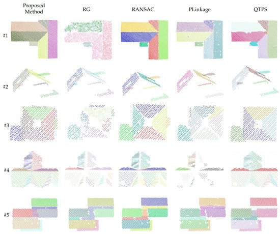 To further evaluate the proposed method, contrastive analysis is performed with four state-of-the-art point cloud segmentation methods on ten typical datasets, as shown in Figure 12 and Figure 13. For datasets #1–#5, all buildings possess typical roof structures with low heights, no point clouds on the elevation, low noise, clear edges, and uniform point cloud density. All methods can segment the main shapes of the objects. The RG method relies on the angular difference between the normals of adjacent points, which enables it to detect most of the plane correctly. However, the normal vectors’ divergence at the planes’ intersections makes it difficult for the RG method to correctly assign the points there, as in dataset #4. In addition, the RG method is susceptible to noise and tends to form holes in the segmentation results, as in dataset #1. Compared with the RG method, the RANSAC method has stronger robustness, as can be seen in datasets #1 and #5. However, it is affected by the point cloud density; when the point cloud is dense, the complete structure can be extracted, and when the point cloud density is sparse, there will be unassigned points at the intersections, as can be seen in datasets #2 and #3. Similar to the RG method, the PLINKAGE method is sensitive to noise and tends to create holes in segmented planes. Furthermore, it often misses some points when processing shapes’ boundaries. QTPS uses a robust hierarchical clustering strategy based on a supervoxel, which can handle edges, especially when dealing with sparse point clouds. However, when dealing with a dense point cloud, there may be cross-border supervoxels, resulting in jaggedness at the edges, as can be seen in dataset #1. Our approach yields the optimal segmentation on all datasets, benefiting from the clustering on the Gaussian sphere that extracts the main shapes and the BIP optimization that reassigns outlier points to optimal shapes.