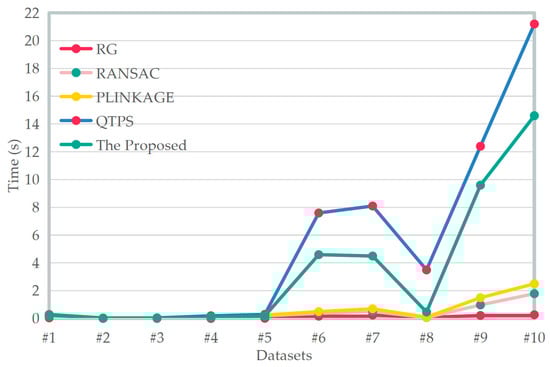 Most of the accuracy metrics of the results from the proposed method are higher than 0.9, except for Recallp and Recalls from datasets #6 and #7. There are very sparse point clouds on the building façade of these two datasets, which make it difficult to form high-brightness point spots when mapped onto the Gaussian sphere, so this part cannot be identified in the main shape. Finally, the time consumption of each algorithm is shown in Figure 15. The time consumption of the RG, RANSAC, and PLINKAGE methods is proportional to the number of point clouds, and the time consumption of the QTPS method and the proposed method grows exponentially with the number of point clouds.