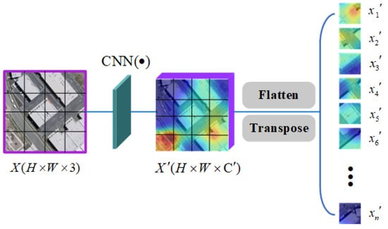 Similar to the standard ViT [] approach, the window-based transformer is set with a patch partition module and a linear embedding module before the transformer block. As shown in Figure 2, the former is responsible for converting bitemporal images into several image tokens (). If the CNN backbone is chosen to acquire the original image features, it converts the feature mapping () into rich semantic tokens. The latter is responsible for mapping image tokens from 3D data to specific 1D data to obtain , which is then fed into the transformer block to generate context-rich semantic tokens and reduced to change feature maps by transposition and reshaping. is the size of the patch, is the number of patches, denotes the dimensions of the feature map, D represents the specific dimensions, and 3 represents the three channels of the optical image.