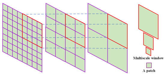 Multiscale window schematic. This figure shows the relationship between the size of the multiscale window and patch and the way the window is distributed.