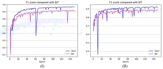 F1 score comparison of SWaF-Trans and BiT on (I) the CDD validation set and (II) the WHU-CD validation set.