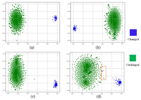 To more intuitively reflect the degree of separation between the changed and unchanged samples, we use t-SNE [] to visualize the distribution form of the samples in a reduced dimension. As shown in Figure 10, where green represents unchanged samples and blue represents changed samples, according to the distributions of (a) and (c), SWaF-Trans has a strong perception ability for both small object changes and large object changes, and both changed and unchanged samples are tightly clustered in the same area. There are clear semantic boundaries between them, so the changes we inferred have clearer boundaries and higher confidence levels. Comparison of the results shown in (d) and (b) indicate that as the proportion of small object change samples in the test set increases, the change samples and unchanged samples in the results of BiT inference become increasingly dispersed and deviate from the category center, and some change samples in the box are misclassified as unchanged samples. This is because some samples with low confidence at the edge of the change region are misclassified by the model, i.e., the “change boundary is blurred”; therefore, BiT does not learn a clear semantic “boundary” between change and no-change samples. In contrast, our method can overcome the abovementioned problem by highlighting the semantic concepts related to interesting changes and enhancing the representation of interesting features so as to obtain more comprehensive multiscale features, which can effectively distinguish between changes and non-changes, as well as perceive small object changes.