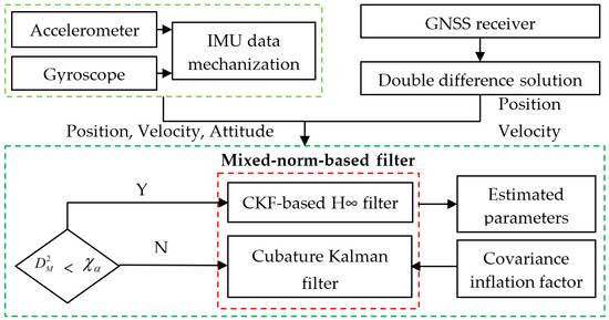 Flowchart of the mixed norm-based filter applied in the multi-GNSS/IMU integrated systems. After mechanization, the IMU can provide the initial position, velocity and attitude information, and the GNSS can provide the initial position and velocity information. The position and velocity differences between IMU and GNSS are regarded as the measurements input into the filter. Square of the Mahalanobis distance is adopted as the test statistics, and the hypothesis test is implemented at each epoch. If the zero hypothesis is rejected, the CKF is implemented and the covariance inflation factor is applied to control the bad effects of the outlying measurements. Otherwise, the H∞ filter is performed.