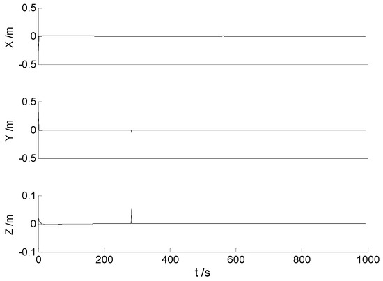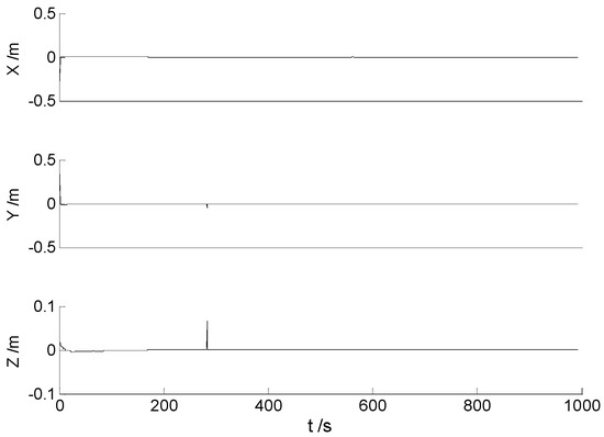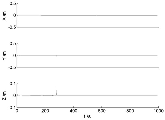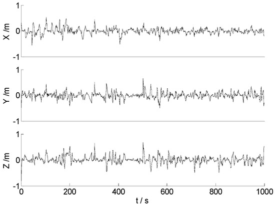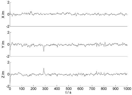 Figure 4, Figure 5, Figure 6 and Figure 7 demonstrate the position error variables of the predicted state vector for different algorithms. It is found from the above figures that the values of these variables are quite small. However, these are just the process variables, and can hardly demonstrate the performance of different algorithms. Since the final position errors (namely, the differences between the referential solution and the calculated solution) are easier to demonstrate the differences of these algorithms, they are plotted to distinguish the performance of different algorithms. Then, the differences from the referential solution of different algorithms are demonstrated in Figure 8, Figure 9, Figure 10 and Figure 11.