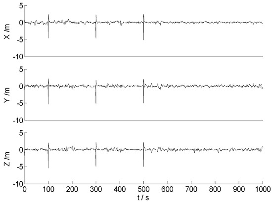 In this case, some significant outliers (40 m) were artificially added into the initial GNSS measurements; thus, the second dataset was constructed. Then, the four designed algorithms were implemented with the second dataset, respectively. Similarly, the position differences from the referential solution are demonstrated in Figure 12, Figure 13, Figure 14 and Figure 15, respectively.