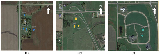 Google Earth Images of the locations of the selected sites with sensor IDs: (a) 4 Sensors Deployed at Arlington Site with Grass and Corn/Soybean Land Coverage; (b) 3 Sensors deployed in North Airport Site with Grass Land Coverage; (c) 2 sensors deployed in Research Park with Alfalfa Land Coverage.