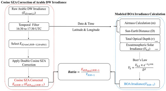 The next step involves calculating the ratio between the cosine solar zenith angle corrected DW irradiance and BOA irradiance (Equation (9)). A threshold is then applied to filter out clear days by analyzing the trends of the ratio vs. time plot. The filtered ratios are used to determine the corresponding dates, which are used for radiometric calibration of the Arable dataset in the final step of the process.