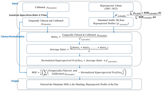 Figure 6 illustrates the step-by-step methodology that demonstrates the effectiveness of using an automated approach with a hyperspectral library to validate remote sensing data against ground truth measurements. To begin the process, the calibrated Arable is temporally filtered based on the selected orbital sensor’s overpass time and dates. On the other hand, ASD SR from the hyperspectral library is converted to simulated Arable SR using Equation (2) to bring both Arable and ASD to the same spectral domain. Next, using the temporally filtered Arable SR and simulated Arable SR, the ratio is calculated for each spectral band to determine the spectral offset. Next, the average ratio is obtained by averaging ratios across the bands per day is to radiometrically rescale to the same numerical range. The normalized ASD can then be calculated by multiplying the average ratios by the simulated ASD from Arable. This brings the ASD measurements to the same level as the Arable reflectance. Once normalized ASD measurements are obtained, the mean square error (MSE) is calculated across all bands using Equation (12). Finally, the measurement with the least MSE is selected as the closest forecast to Arable reflectance.