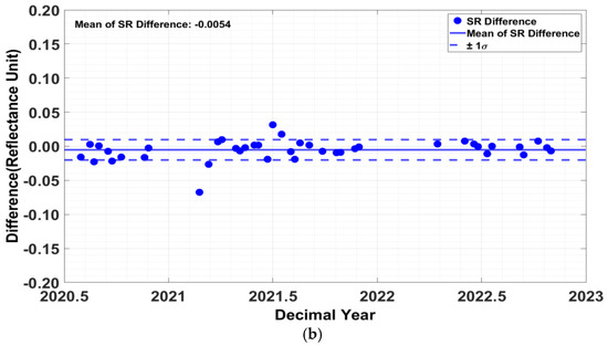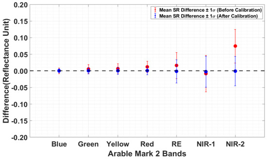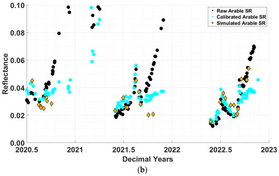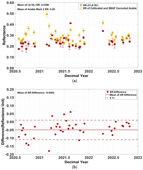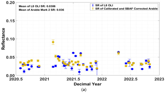 Finally, for the purpose of validating the distinction between the calibrated and SBAF corrected Arable sensor’s SR and the orbital sensor (L8 OLI L2) SR, Equation (19) is utilized. The equation is expressed as: