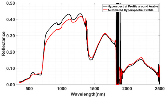 In the context of multispectral Arable SR data, the primary objective is to convert it into hyperspectral data by identifying the most suitable match for the simulated arable reflectance (estimated from ASD around Arable) shape compared to the arable reflectance observed on a specific day. Figure 10 illustrates the hyperspectral surface reflectance vs. wavelength graph. The black color line represents the hyperspectral profile acquired with ASD on 16 August 2020 near the Grass A sensor(C003969) in the North Airport site; simultaneously, the red color is the hyperspectral surface reflectance on 11 October 2015 from 3M vegetation Brookings site selected as the best-fit from the automated library process (discussed in Section 3.2). This hyperspectral reflectance profile was then used for the SBAF estimation (see Section 3.2 latter). In some cases, the best-fit automated profile will give the actual hyperspectral profile acquired. Similarly, the same process will be applied to other days to obtain the best fit hyperspectral profile.