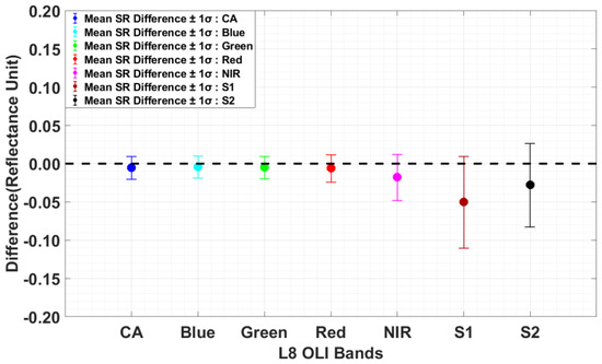 Figure 14 shows the mean SR difference between calibrated and SBAF corrected Arable SR and their standard deviations for each spectral band. Despite the Arable not having the spectral information to fully cover the CA band, the use of the SBAF and the Arable’s Blue band was extended and used validate to the CA within less than one reflectance unit. The average difference for validation using the blue, green, and red bands was less than half a reflectance unit. In the case of the NIR-2 channel and SWIR-2, we were able to validate those bands with an average difference of less than 3 reflectance units. On the other hand, the SWIR-1 channel was validated with an average difference of about 5 reflectance units in relation to the calibrated and SBAF corrected Arable SR. Refer Table 3 for precise mean values.