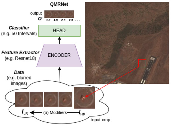 We designed a novel objective function that is able to optimize super-resolution algorithms upon a specific quality objective using QMRNet (see Figure 3). Given a GAN or autoencoder network, we can add an ad hoc module based on a specific (or several) parameters of QMRNet. The QMRLoss is obtained by computing the classification error between the I S R prediction and the original I H R . This classification error determines whether the SR image is distinct in terms of a quality parameter objective (i.e., b l u r   σ , F, GSD, r e r or s n r ) with respect the HR. The QMRLoss has been designed to use any classification error (i.e., BCE, L1 or L2) and can be summated to the perceptual or content loss of the generator (decoder for autoencoders) in order to tune the SR to the quality objective.