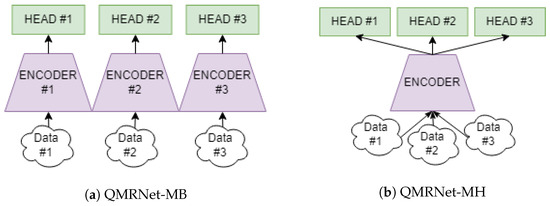 Figure 2. Multiparameter architectures to simultaneously predict several distortions in one run. (a) Multibranch QMRNet (QMRNet-MB), example with 3 stacked QMRNets (3 encoders with 1 head each). (b) Multihead QMRNet (QMRNet-MH), example with 3 heads.