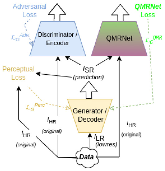 Figure 3. Super-resolution model pipeline (encoder–decoder for autoencoders and generator–discriminator for GANs) with ad hoc QMRNet loss optimization. Note that all losses (i.e., L D A d v , L G P e r c and L G Q M R ) are considered for the case of MSRN optimization with QMRNet; see Section 4.4.