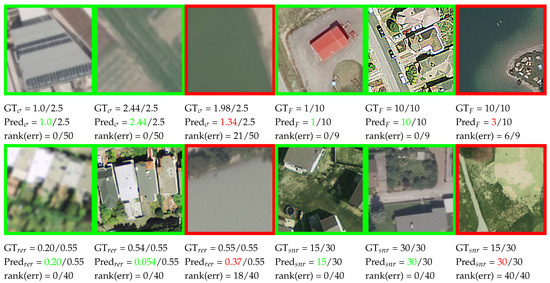 In Table 4 we show the validation results (Inria-AILD-180-test) with the trained QMRNet using a ResNet18 backbone with the Inria-AILD-180-train data. We can observe that the overall medRs are around 1.0 (predictions are about one interval of distance with respect to the targets) and recall rates (exact match) are for top-1 (R@1) around 70% and for R@5 and R@10 (prediction is in an interval below 5 and 10 of the distance with respect to the target, respectively) around 100%. This means our network is able to predict the parameter data ( b l u r   σ , sharpness F, GSD, s n r , r e r ) with a very high retrieval precision, even when the parameters are fine-grained (e.g., 40 or 50 class intervals). The best results appear for low N parameters (smaller classification tasks), such as F and GSD. Here, GSD is mostly an easy task, as the scaling of objects is constant whether the images are distorted or not. In terms of the crop size, the best results are mostly in a higher input resolution of networks ( R = 1024 × 1024 ); this may vary on the selected backbone for the encoder (here, Resnet18 is mostly used with input R around 256 × 256 ).