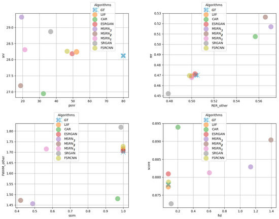 Above (Figure 8) we demonstrate the validity of some of our metric results by comparing them with each homologous measurement, namely, the ones measuring similar or the same properties. Here, we compared QMRNet’s s n r and PSNR↑. These measure the quantity of noise over information of the image. The first subplot shows an anticorrelation (↙) on the algorithm values in these two metrics, with LIIF being closest to the I H R (GT) and CAR, M S R N 2 and M S R N 3 having both the lowest s n r (best) and PSNR (worst). For the case of QMRNet’s r e r and measured R E R o t h e r (which corresponds to the RER that measures diagonal contours), there is a positive correlation (↗), with CAR, M S R N 2 and M S R N 3 outperforming the rest of the algorithms. We also compared F W H M o t h e r and SSIM↑ to see how well each algorithm performs when evaluating the diagonal contour width as well as the structural similarity, and it appears that M S R N 2 , M S R N 3 and CAR have the lowest (best) F W H M and most algorithms have the same values of SSIM as the original GT images (unchanged). In the last subplot we compared the QMRNet’s s c o r e (composed of the weighted mean of QMRNet’s s i g m a , r e r , s n r , G S D and F) and FID↓, which measures the Fréchet distribution distance between images. Here M S R N 2 , M S R N 3 and CAR show the highest s c o r e with higher (worse) FID, while most algorithms are close to the original image (almost unchanged). Note that in these plots we super-resolve x4 the original image so that full-reference metrics can only compare with the original image (thus, there is no downsampling of inputs so that the I H R would be equivalent to the I L R input). Here, we need to consider how the algorithms actually perform in metrics that can evaluate better than the original image.