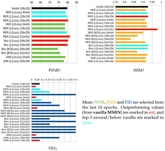 In Figure 9 we show that several strategies such as QMRLoss using r e r (and L1 loss) obtain better results than vanilla MSRN in the PSNR, SSIM and FID metrics. Here, the PSNR improves with QMRNet using L1 loss and crops of 256 × 256 as well as with L2 loss with 512 × 512. It also improves with the b l u r metric both with L1 and L2 loss on 256 × 256 crops. The SSIM improves with L1 loss in QMRNet that uses RER and significatively (almost 1.0) with r e r L2 loss with crops of 512 × 512. For FID, using QMRNet improves MSRN with r e r and all types of losses (L1, L2 and BCE) using crops of 64 × 64, here as well using QMRNet with s n r metric and L1 loss, using crops of 64 × 64 and 128 × 128.