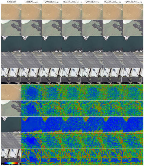 In Figure 10, Figure 11 and Figure 12 can be observed the changes of super-resolving UCMerced and Inria-AILD images according to every QMRNet optimization. In most cases of MSRN v a n i l l a (column 2 colormaps) there is a center bias, especially in sparse/homogeneous regions. In Figure 11, row 3 and Figure 12, row 1 it can be observed that QMRLoss G S D , L 1 and QMRLoss F , L 1 significatively enhance the noise present in the homogeneous areas (sea/beach), while QMRLoss σ , L 1 , QMRLoss r e r , L 1 and QMRLoss s n r , L 1 present a smoother solution whilst having higher oversharpening than MSRN v a n i l l a .