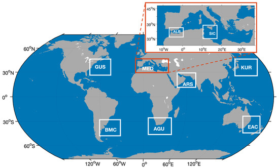 We focus on oceanic regions where SST features are mainly driven by the meso to sub-mesoscale horizontal/vertical dynamics, thus selecting areas characterized by enhanced eddy activity (i.e., high eddy kinetic energy) [38,39] or upwelling systems [40,41]. This led to the identification of the following areas Of interest (AOI) (Figure 1):