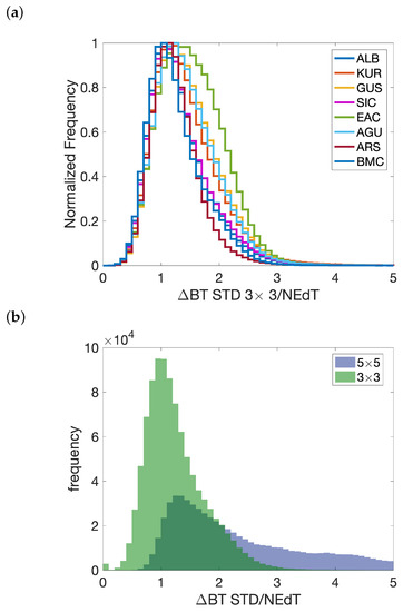 (a) Distribution of the ratio between the 3×3 pixel standard deviation (STD) of ΔBT and the associated noise. The analyses are reported per each AOI of Figure 1. (b) Distributions of the ratio between a 3 × 3 (green) and a 5 × 5 (blue) ΔBT STD and its associated noise. Example for the study case over the KUR AOI on 19 September 2021 reported in Figure 2.