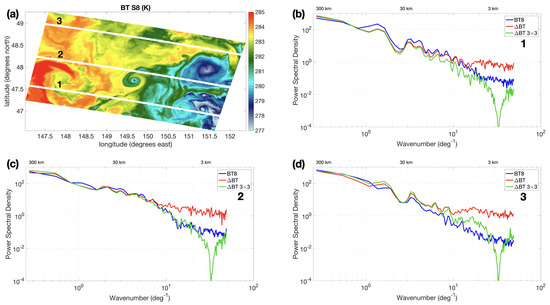 (a) TOA BT (S8 channel) field over the Kuroshio area on 19 September 2021 at 23:20 UTC, acquired by Sentinel 3A. (b–d) Power spectral densities of TOA BT S8 (blue), Split Window (SW) term (red) and SW averaged over a 3 × 3 pixel area for the cross-sections 1–3 reported in panel (a). The PSD is presented as a function of the wavenumber, the corresponding spatial scales are also reported.