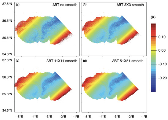 BT terms for ECOSTRESS SST retrieval. (a) No smoothing, (b–d) 3 × 3, 11 × 11 and 51 × 51 smoothing average, respectively.