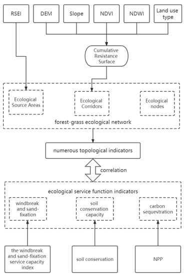 This article employs the RSEI index to preliminarily extract ecologically significant areas and utilizes the digital elevation model (DEM), slope, normalized vegetation index (NDVI), normalized difference water index (NDWI), and soil cover type data to derive cumulative resistance surfaces for constructing a forest and grassland ecological spatial network. The various topological indices of the forest and grassland ecological spatial network are calculated, and their correlations with ecological service capacity indices (sand fixation, soil conservation, and carbon sequestration) are analyzed. The data processing flow and idea of this paper are shown in Figure 1.