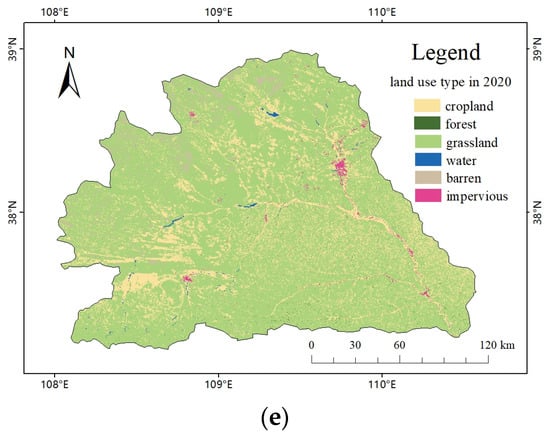 Ecological resistance factors of the study area in the year 2020. (a) DEM in 2020, (b) Slope in 2020, (c) NDVI in 2020, (d) NDWI in 2020, (e) Land use type in 2020.