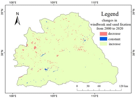 Changes in windbreak and sand fixation in the study area from 2000 to 2020.