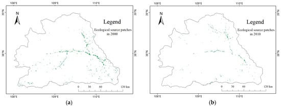 In 2020, source areas were distributed in all parts of the basin, mainly concentrated in the southeast and north, with three patches in the northeast–southwest direction in the southeast, belt-shaped distribution in the northwest–southeast direction in the north, and scattered distribution in other areas without an obvious trend of distribution along the water system. Compared with 2015, the number and total area of source areas decreased, and the distribution became more scattered. The number of source areas decreased in the central and southern parts and increased in the central-western and northern parts. Compared with 2000, the total number and area of source areas decreased in 2020, with a total area of only 48.6% of that in 2000, and the average area of each source area significantly decreased. The distribution pattern of source areas was no longer along the path of the Wuding River water system, and the overall distribution was more scattered and uniform. From 2000 to 2020, the distribution of source areas showed a pattern of more numerous and larger patches in the loess hill and gully region, and smaller and scattered patches in the sandy area, which was consistent with the natural conditions and cognitive experience. The distribution of ecological sources from 2000 to 2020 is shown in Figure 7.