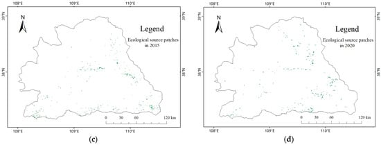 Distribution of ecological source areas in the study area from 2000 to 2020. (a) Ecological source patches in 2000, (b) Ecological source patches in 2010, (c) Ecological source patches in 2015, (d) Ecological source patches in 2020.