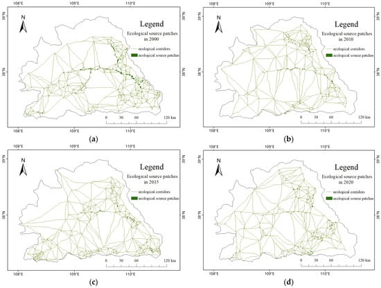 Ecological corridors in the study area from 2000 to 2020. (a) Ecological corridors in 2000, (b) Ecological corridors in 2010, (c) Ecological corridors in 2015, (d) Ecological corridors in 2020.