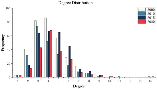Degree distribution of the forest–grassland ecological network in the study area from 2000 to 2020.