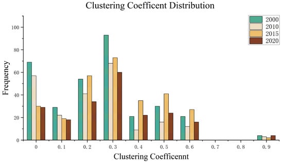 The clustering coefficients of the potential forest and grassland ecological network is shown in Figure 12, and their values reflect the degree of clustering of ecological nodes, usually ranging from 0 to 1. In 2000, there were 69 nodes with a clustering coefficient of 0, 29 nodes with a coefficient of 0.1, 54 nodes with a coefficient of 0.2, 93 nodes (the most nodes) with a coefficient of 0.3, 21 nodes with a coefficient of 0.4, 30 nodes with a coefficient of 0.5, 21 nodes with a coefficient of 0.6, and 4 nodes with a coefficient of 0.9. In 2010, there were 57 nodes with a clustering coefficient of 0, 22 nodes with a coefficient of 0.1, 41 nodes with a coefficient of 0.2, 68 nodes (the most nodes) with a coefficient of 0.3, 9 nodes with a coefficient of 0.4, 16 nodes with a coefficient of 0.5, 12 nodes with a coefficient of 0.6, and 3 nodes with a coefficient of 0.9. In 2015, there were 30 nodes with a clustering coefficient of 0, 19 nodes with a coefficient of 0.1, 57 nodes with a coefficient of 0.2, 73 nodes (the most nodes) with a coefficient of 0.3, 35 nodes with a coefficient of 0.4, 41 nodes with a coefficient of 0.5, 27 nodes with a coefficient of 0.6, and 2 nodes with a coefficient of 0.9. In 2020, there were 29 nodes with a clustering coefficient of 0, 18 nodes with a coefficient of 0.1, 34 nodes with a coefficient of 0.2, 60 nodes (the most nodes) with a coefficient of 0.3, 22 nodes with a coefficient of 0.4, 24 nodes with a coefficient of 0.5, 16 nodes with a coefficient of 0.6, and 4 nodes with a coefficient of 0.9.